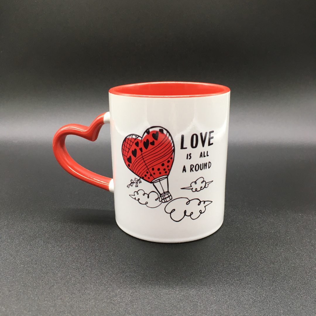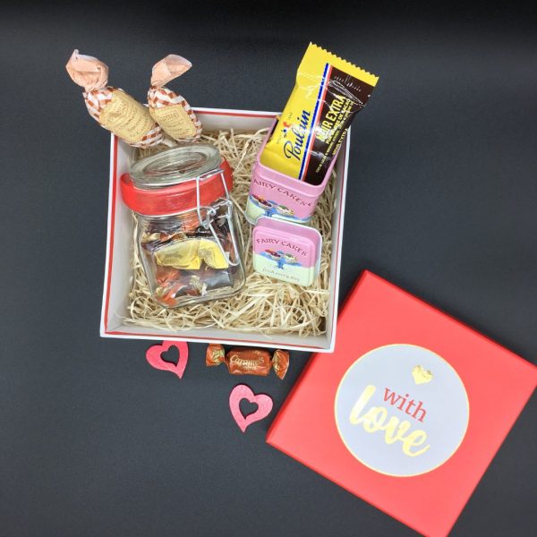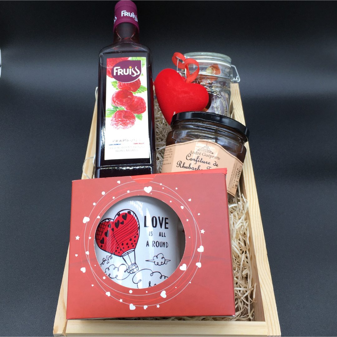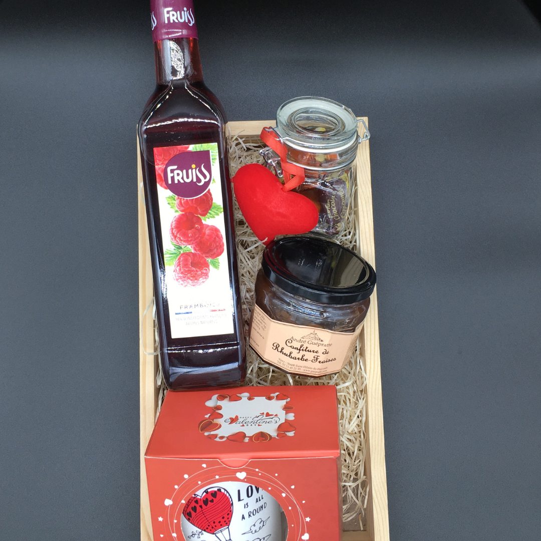Bandeja de madera que contiene una botella de Sirope de Frambuesa, una Taza “Love is All Around”, un Frasco de vidrio con Caramelo Tierno de Dupont d’Isigny de 4 sabores (Chocolate, Vainilla, Avellana y Café), un Tarro de Mermelada artesanal de Ruibarbo y Fresas, un corazón rojo de terciopelo.