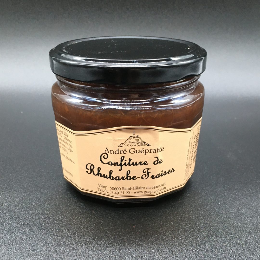 Un tarro de Mermelada de Ruibarbo y Fresas, 370g, elaborado artesanalmente en Normandía (Francia) por André Guépratte