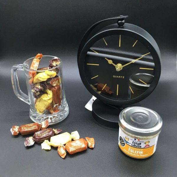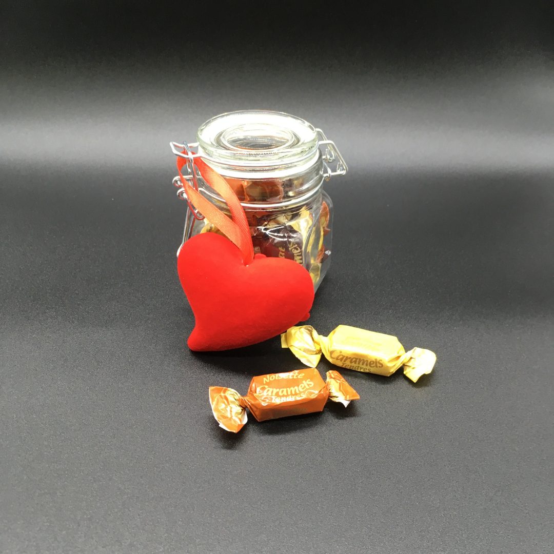 Un Frasco de vidrio con Caramelo Tierno de Dupont d’Isigny : Sabroso caramelo tradicional con 4 sabores: Chocolate, Vainilla, Avellana y Café, elaborado en Normandía (Francia)