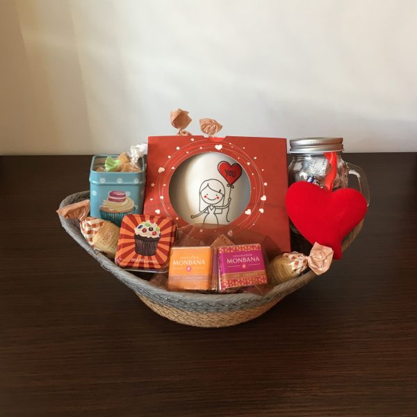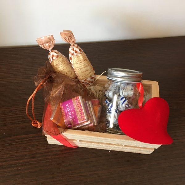 Bandeja de madera que contiene una botella de Sirope de Frambuesa, una Taza “Love is All Around”, un Frasco de vidrio con Caramelo Tierno de Dupont d’Isigny de 4 sabores (Chocolate, Vainilla, Avellana y Café), un Tarro de Mermelada artesanal de Ruibarbo y Fresas, un corazón rojo de terciopelo.