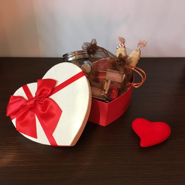 Bandeja de madera que contiene una botella de Sirope de Frambuesa, una Taza “Love is All Around”, un Frasco de vidrio con Caramelo Tierno de Dupont d’Isigny de 4 sabores (Chocolate, Vainilla, Avellana y Café), un Tarro de Mermelada artesanal de Ruibarbo y Fresas, un corazón rojo de terciopelo.