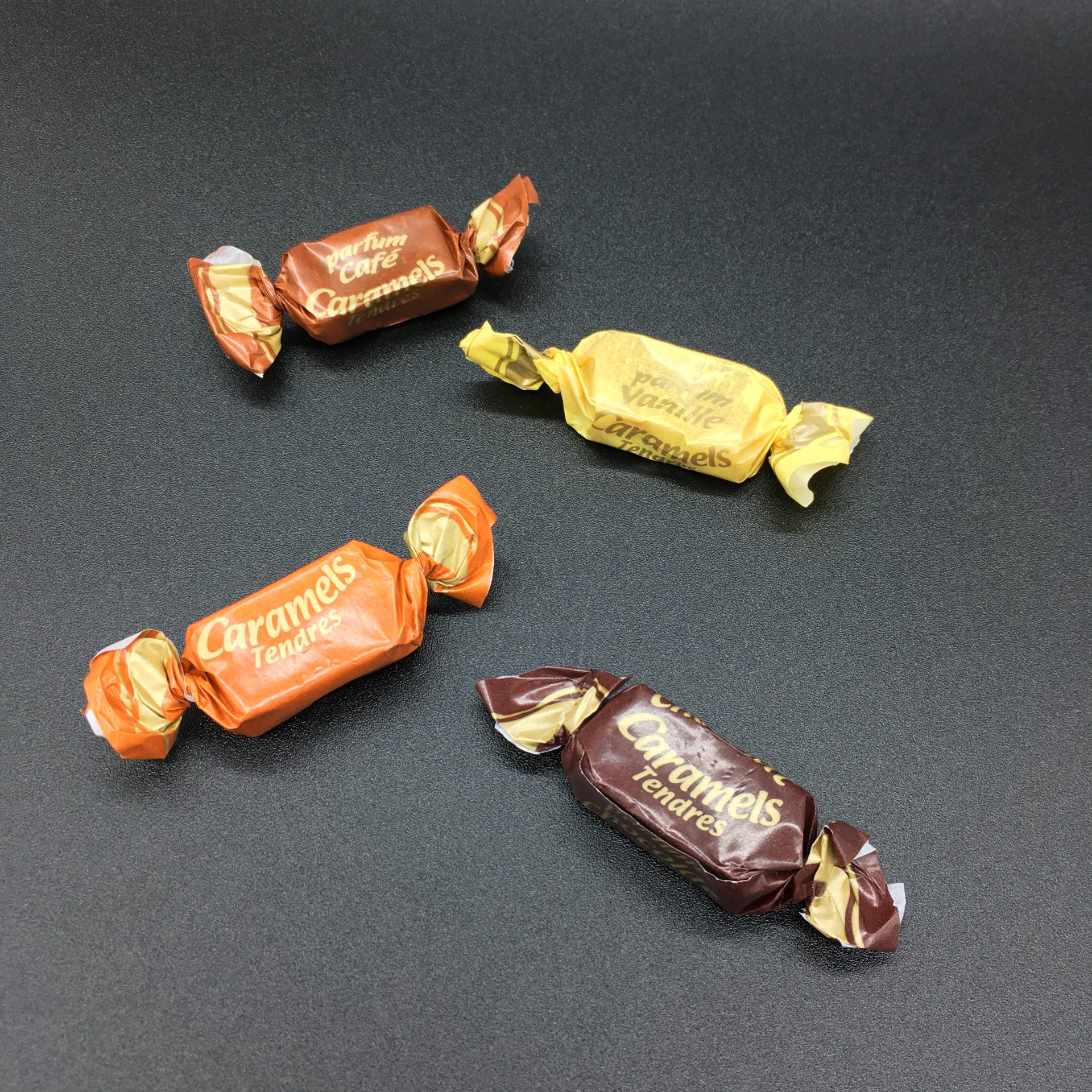 Surtido de sabroso caramelo tradicional con 4 sabores: vainilla, chocolate, avellana y café