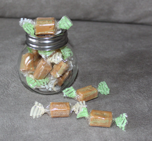 Un Frasco de vidrio con 70g de Caramelo Fondant, 3 sabores: Mantequilla Salada, Vainilla y Avellana. Sabroso caramelo que no se pega a los dientes, elaborado artesanalmente en Isigny-sur-Mer (Francia)