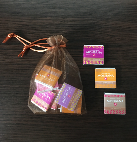 Una bolsita de Cuadraditos de Chocolate con Leche Monbana (6 recetas : Leche 33% cacao, Leche con cereales, Leche con chips de Turrón de Montélimar, Leche caramelo, Leche Praliné, Leche Cappuccino. Chocolate con leche 33% cacao. Bolsita de 8 chocolates surtidos)