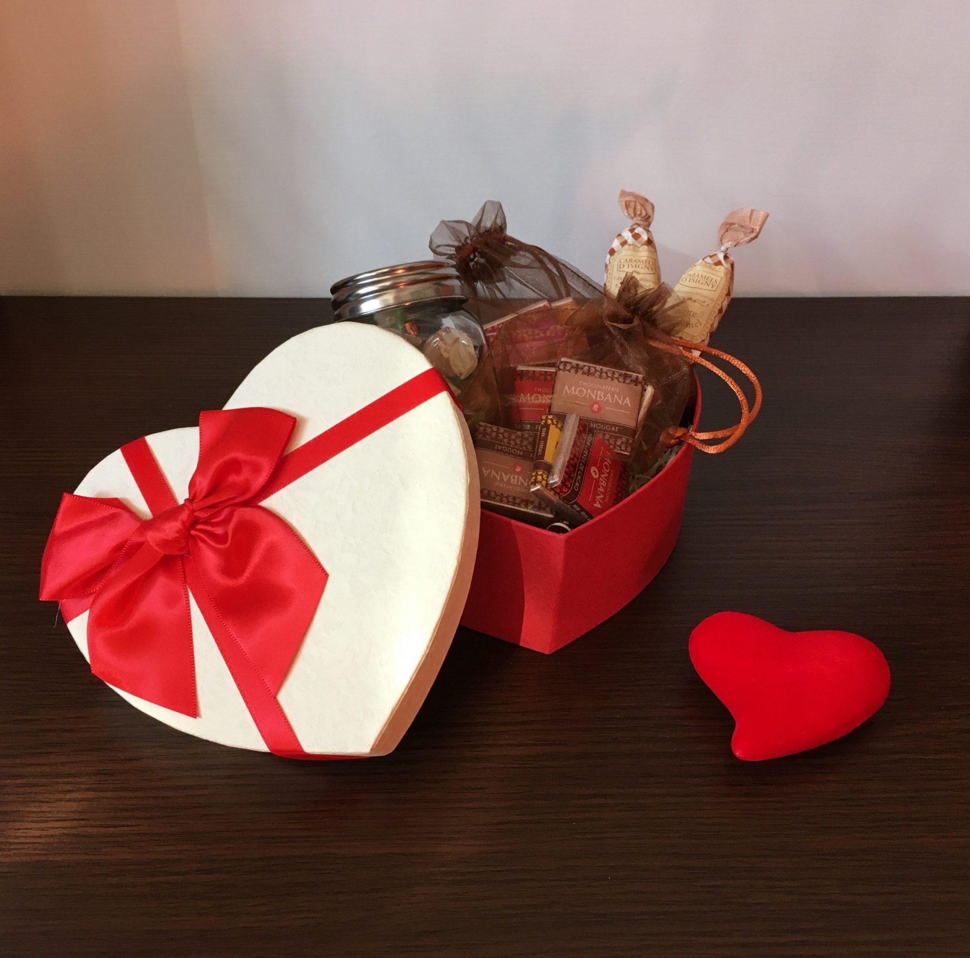 Caja de madera que contiene una bolsita de Cuadraditos de Chocolate con Leche Monbana, una Mini Jarra de vidrio con 50g de Caramelo de Mantequilla Salada de Isigny, dos Piruletas de Caramelo Salado, un corazón rojo de terciopelo.