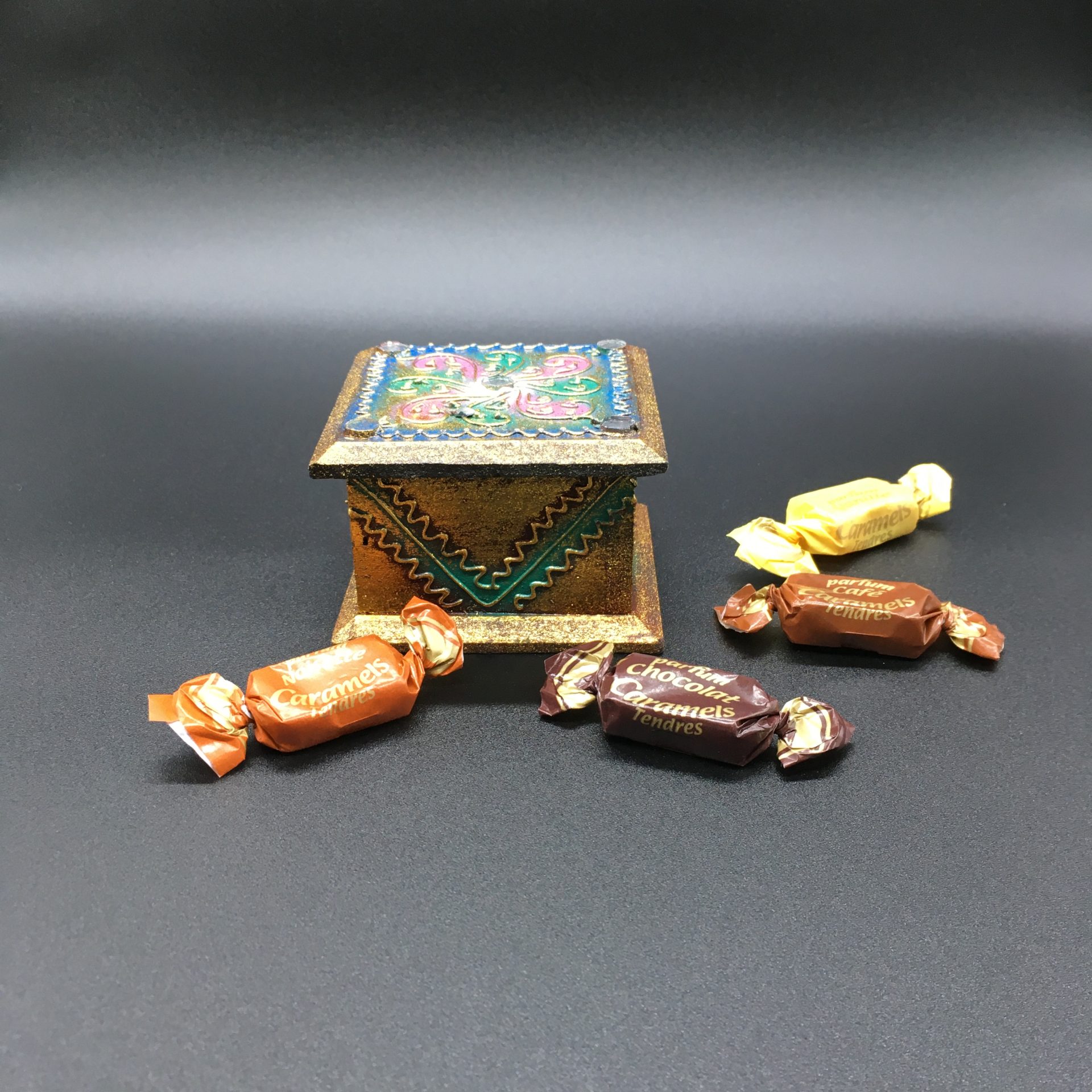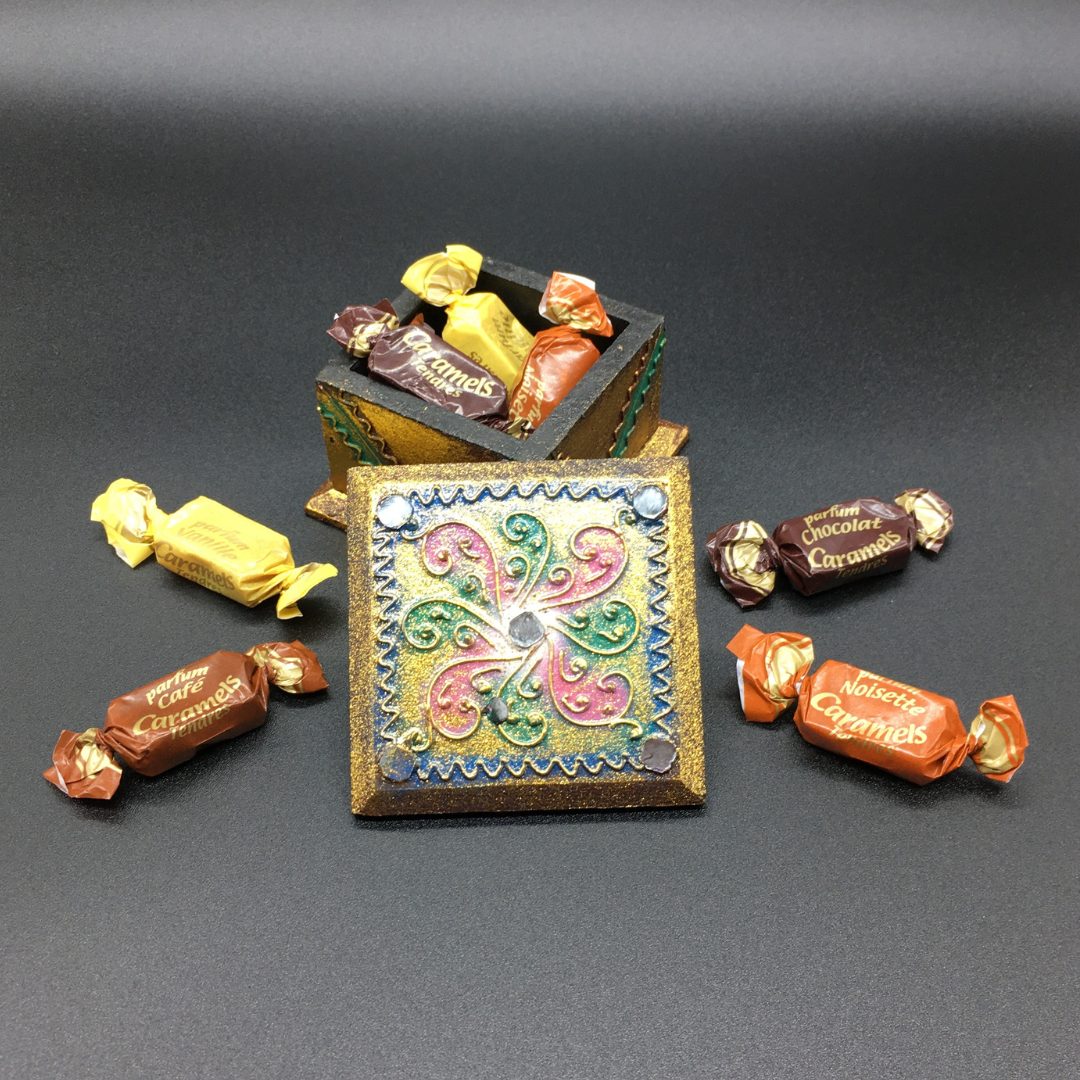 Cajita de madera Batik con 30g de Caramelos tiernos de Dupont d’Isigny.