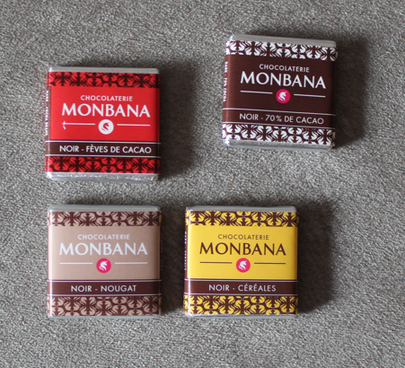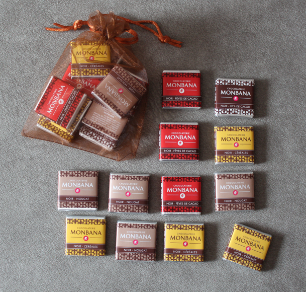 Una bolsita de Cuadraditos de Chocolate Negro Monbana, ideal para acompañar un café (Bolsita de 10 chocolates surtidos): 4 recetas : Negro 70%, Negro con pepitas de cacao de Ghana, Negro con chips de turrón de Montélimar, Negro con cereales crujientes. Chocolate negro 70% cacao.
