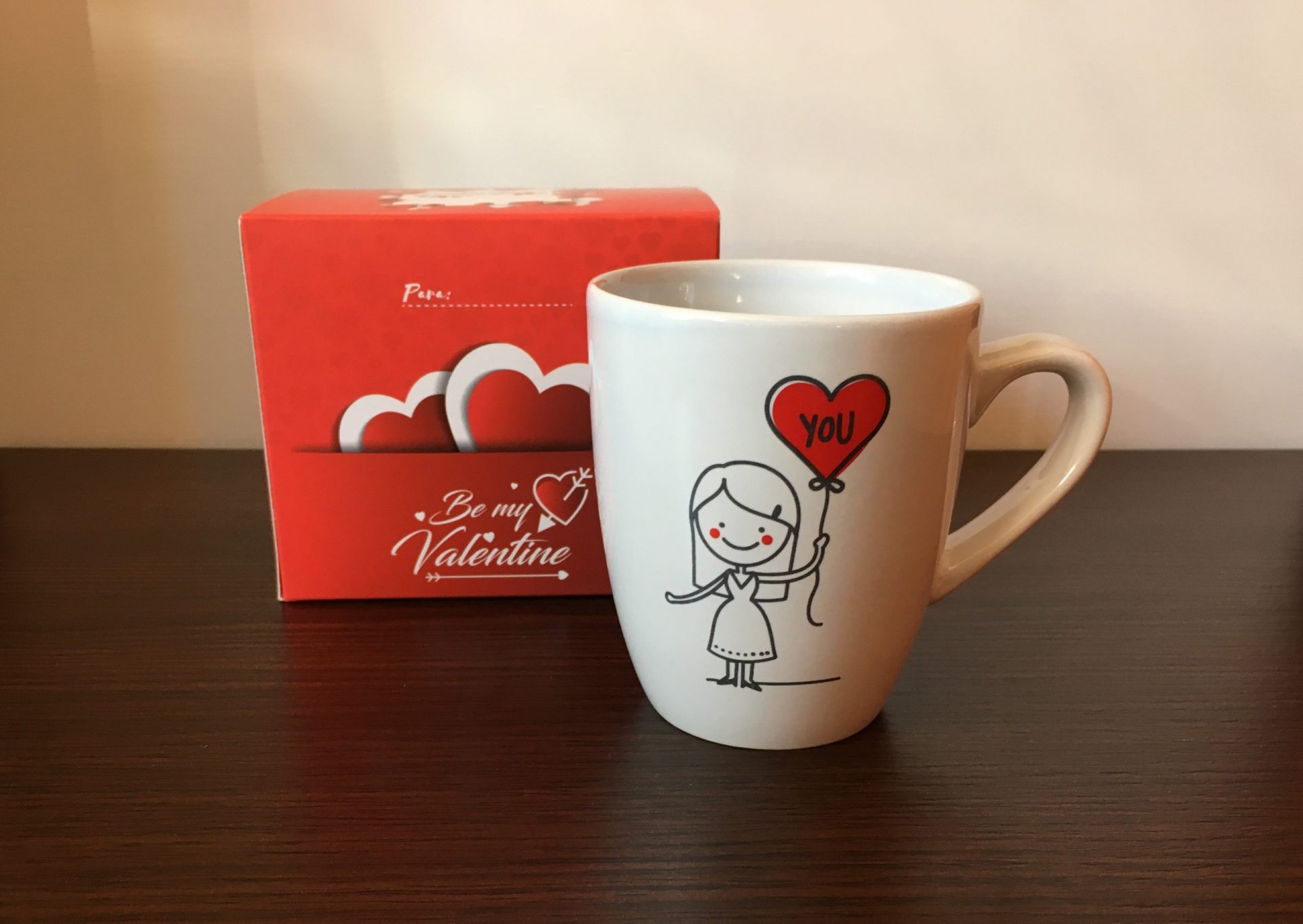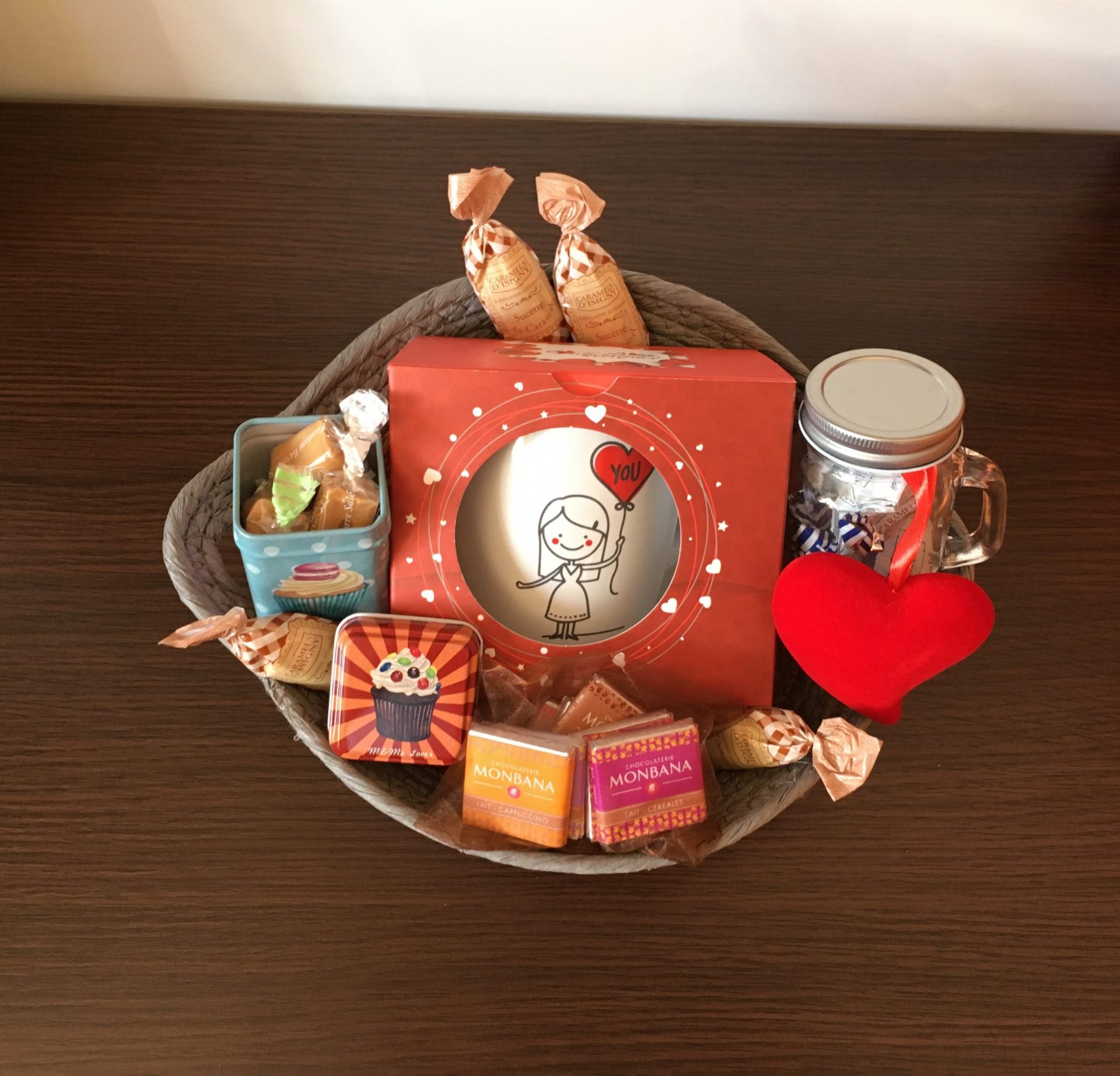 Cesta de cuerda bicolor que contiene una Taza con tiza, una bolsita de Cuadraditos de Chocolate Negro Monbana, una Mini Jarra de vidrio con 50g de Caramelo de Mantequilla Salada de Isigny, cuatro Piruletas de Caramelo Salado, una Mini Caja de lata decorada con 40g de Caramelo Fondant 3 sabores, un corazón rojo de terciopelo.