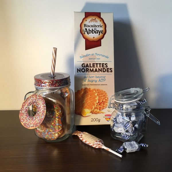 Una Mini Jarra de vidrio con 50g de Caramelo de Mantequilla Salada de Isigny : Sabroso caramelo tradicional con un toque de sal que resalta su sabor, elaborado artesanalmente en Isigny-sur-Mer (Francia)