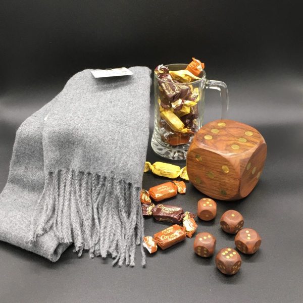 Cesta de cuerda bicolor que contiene una Taza con tiza, una bolsita de Cuadraditos de Chocolate Negro Monbana, una Mini Jarra de vidrio con 50g de Caramelo de Mantequilla Salada de Isigny, cuatro Piruletas de Caramelo Salado, una Mini Caja de lata decorada con 40g de Caramelo Fondant 3 sabores, un corazón rojo de terciopelo.