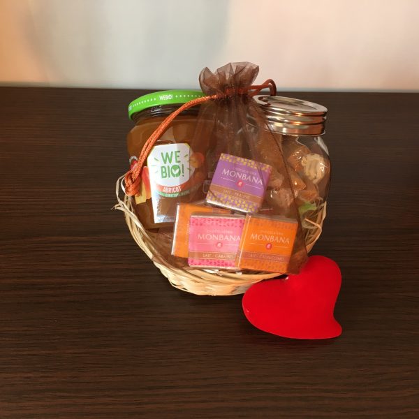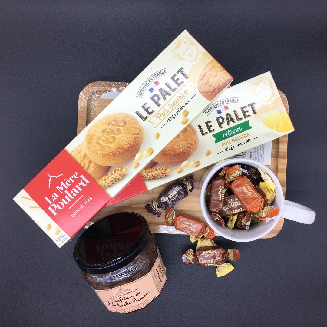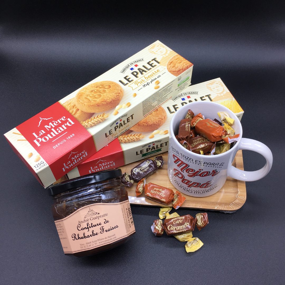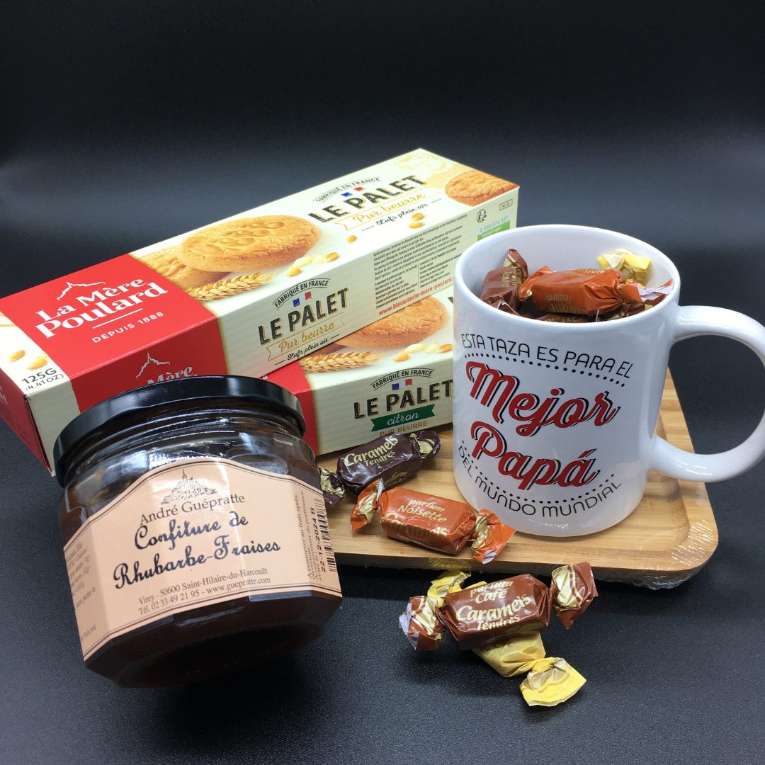 Contiene una Bandejita de bambú, una Taza “esta taza es para el mejor papá del mundo mundial” rellena con un surtido de Caramelos tiernos de Dupont d’Isigny de 4 sabores: Vainilla, Chocolate, Avellana y Café, un paquete de Galletas de Mantequilla “Palet” de la Mère Poulard, un paquete de Galletas de Mantequilla con Limón “Palet” de la Mère Poulard y un bote de Mermelada artesanal de Ruibarbo y Fresa de André Guépratte.