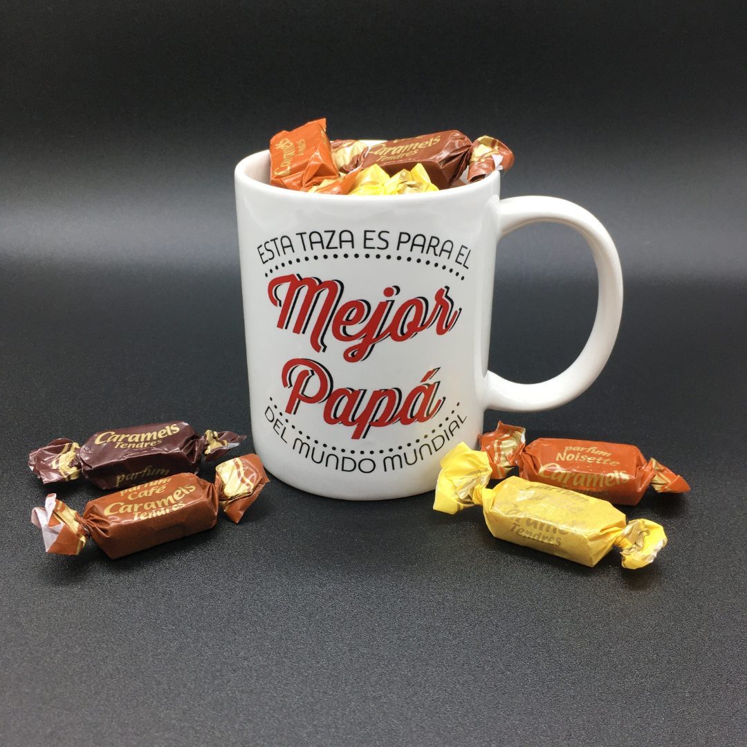 Una Taza con mensaje “Esta taza es para el mejor papá del mundo mundial”, rellena con un surtido de Caramelos tiernos de Dupont d’Isigny (Carentan, Francia) de 4 sabores : Vainilla, Chocolate, Avellana y Café – 110 g