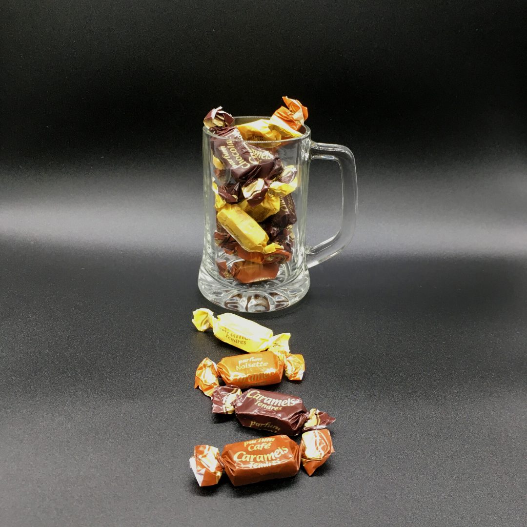 Una Jarra de cerveza de 30 cl, rellena de Caramelos Tiernos de Dupont d’Isigny (Carentan, Francia) de 4 sabores: Chocolate, Café, Avellana y Vainilla – 110 g