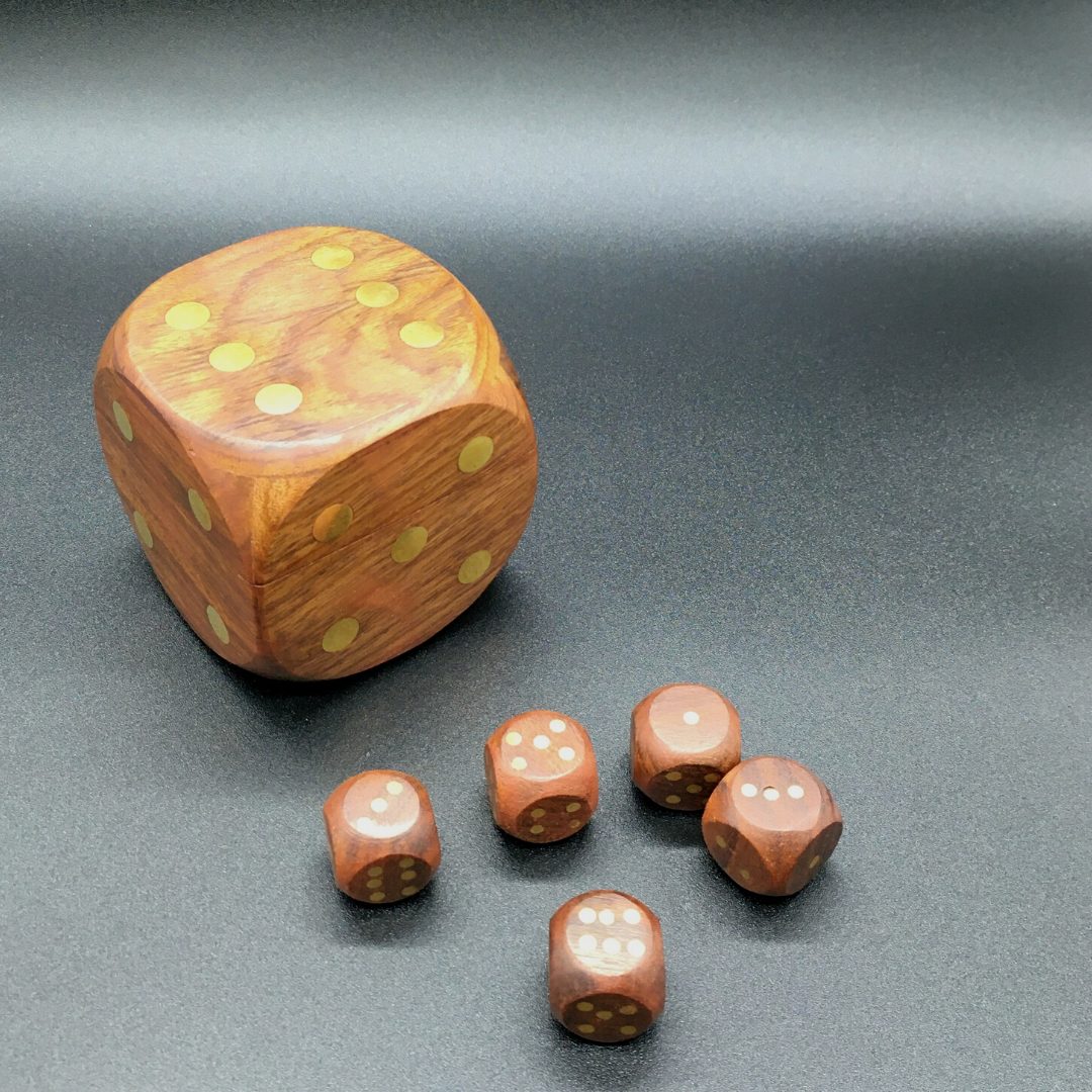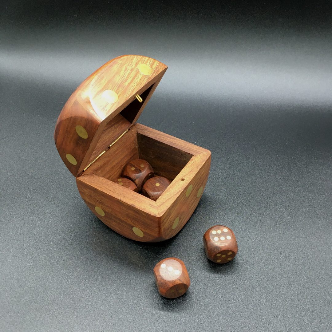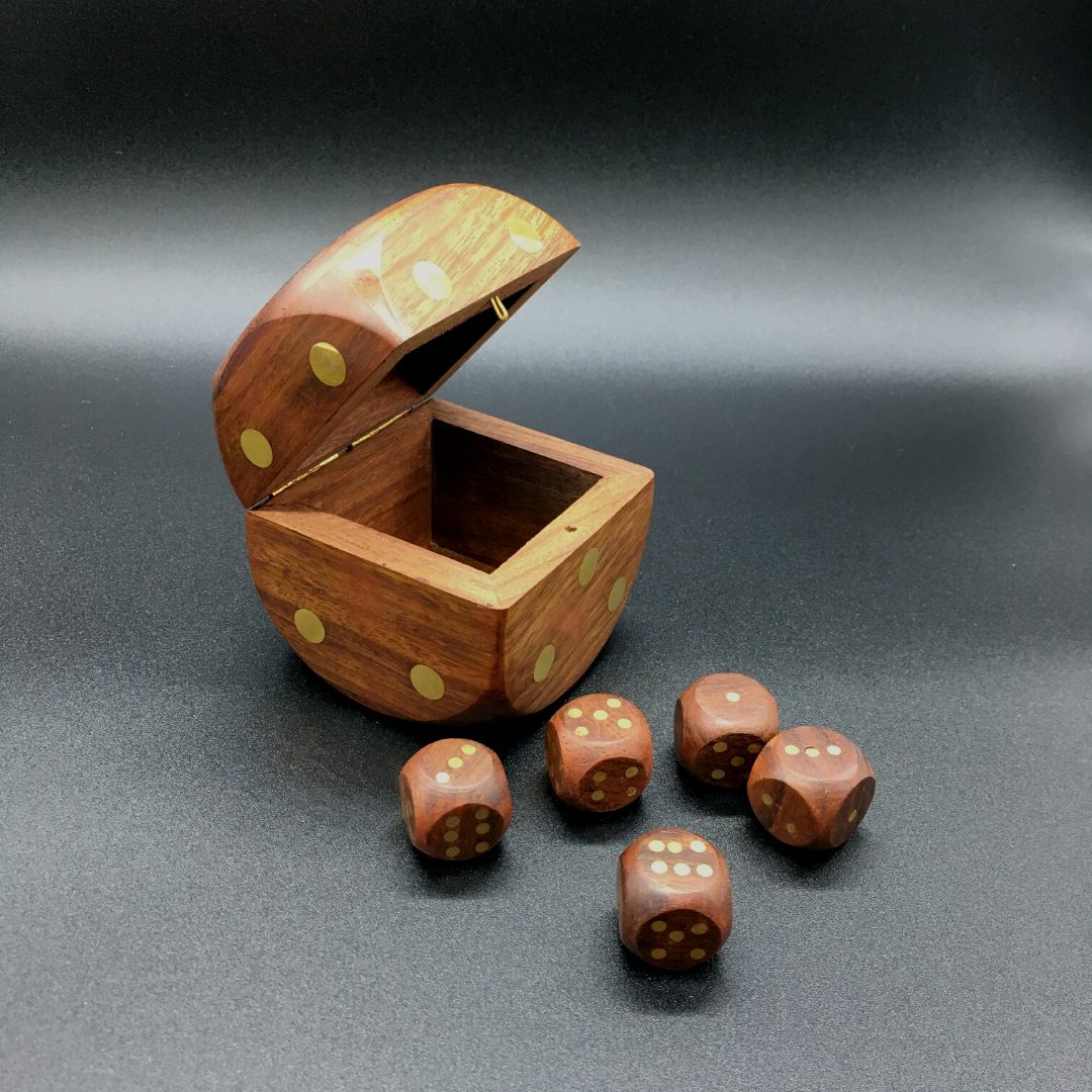Un Juego de 5 Dados de madera de Sheesham y latón, cómodamente guardado en un dado de 7,5 x 7,5 x 7,5 cm
