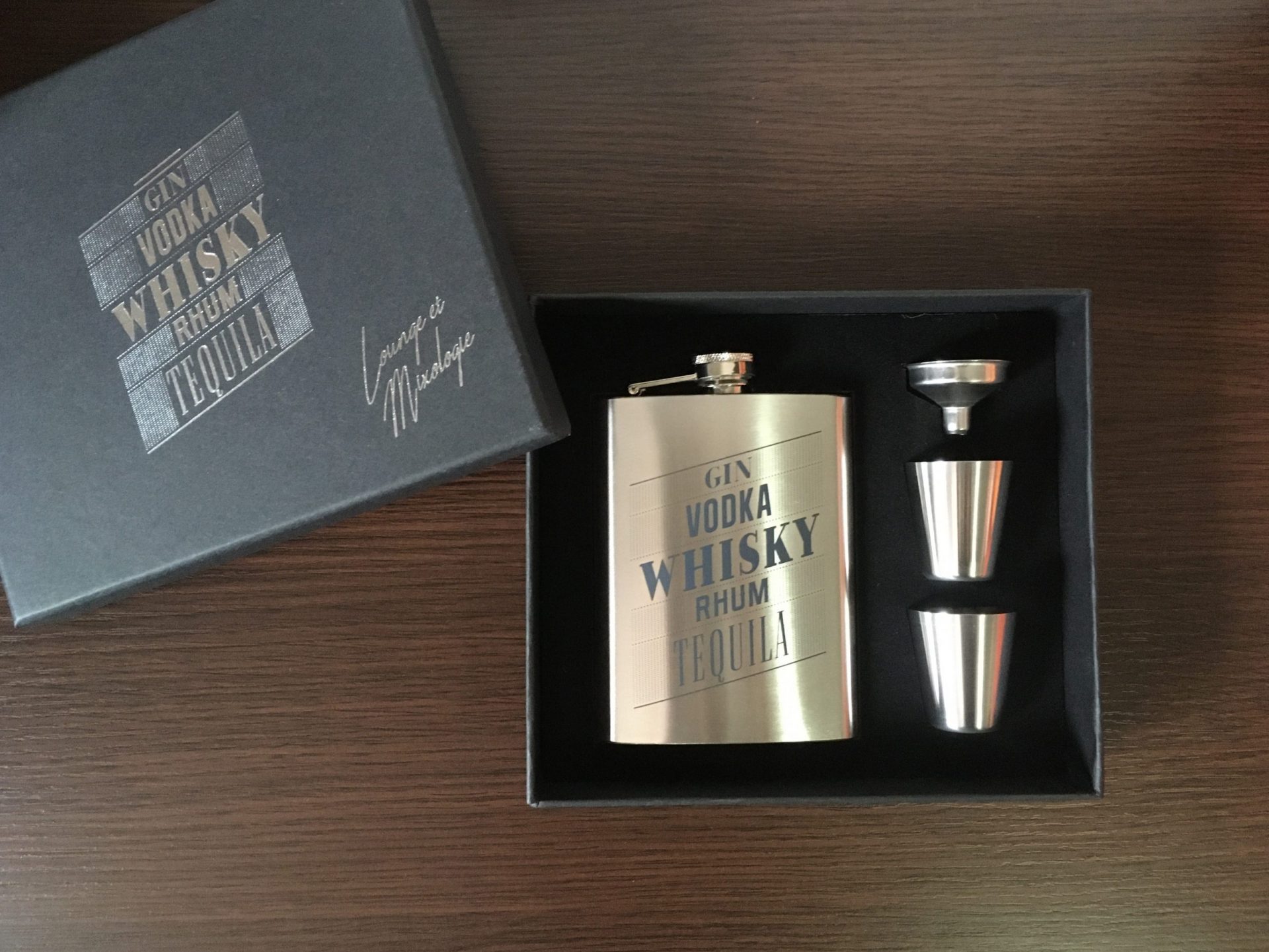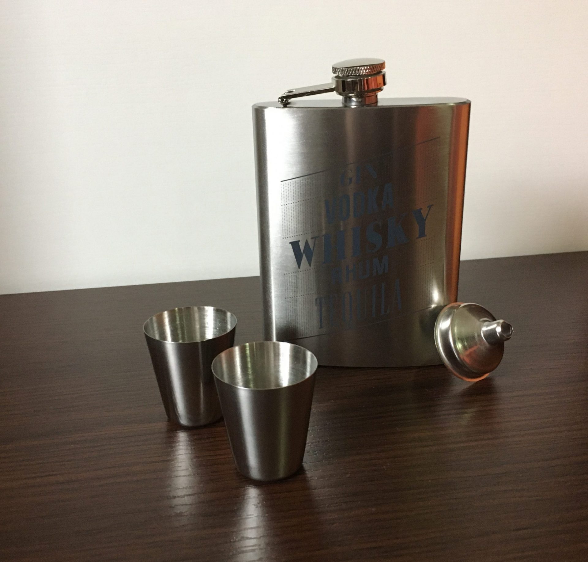 Una petaca de acero inoxidable, con 2 chupitos y un embudo para rellenarla con más facilidad.