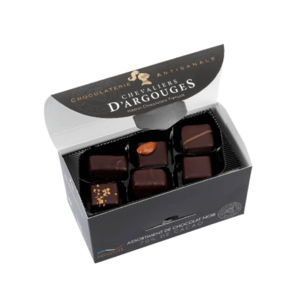 Derrítete de placer con nuestro surtido de bombones de chocolate negro 70% cacao, presentado en una elegante caja de 185g. Descubre el crujido de nuestros pralinés y la suavidad de nuestros ganaches cubiertos de chocolate negro 70%.